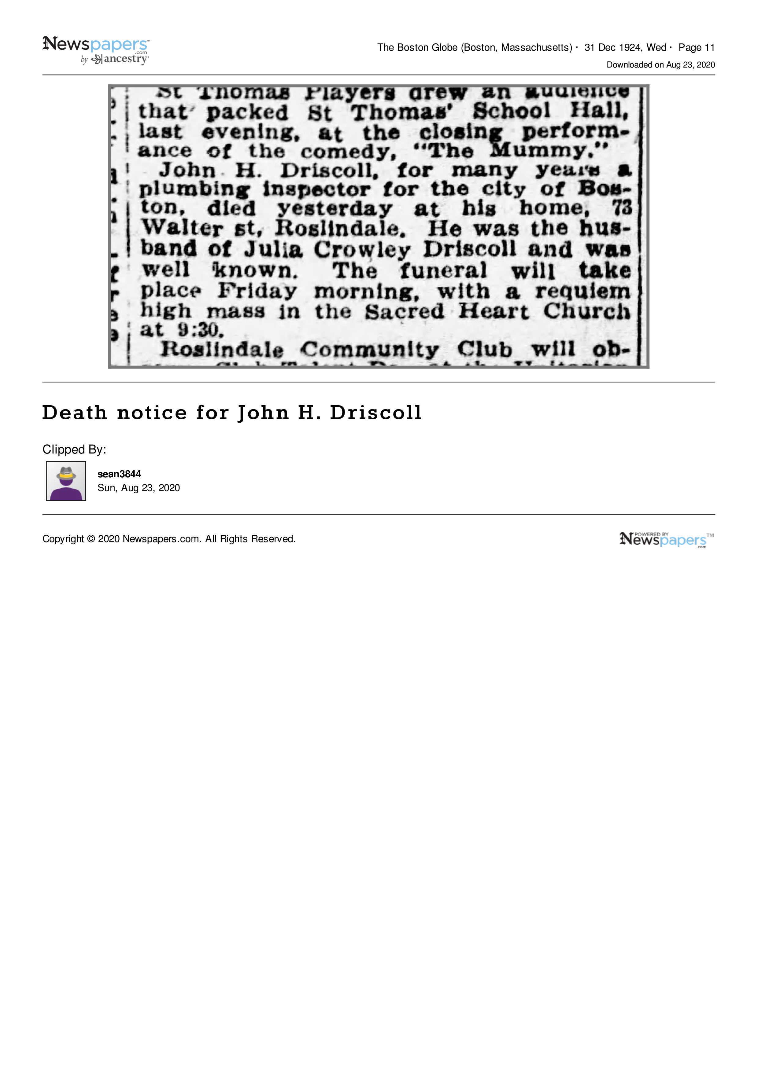 | Born | 19 March 1865, Boston, MA | Census, Driscoll notes |