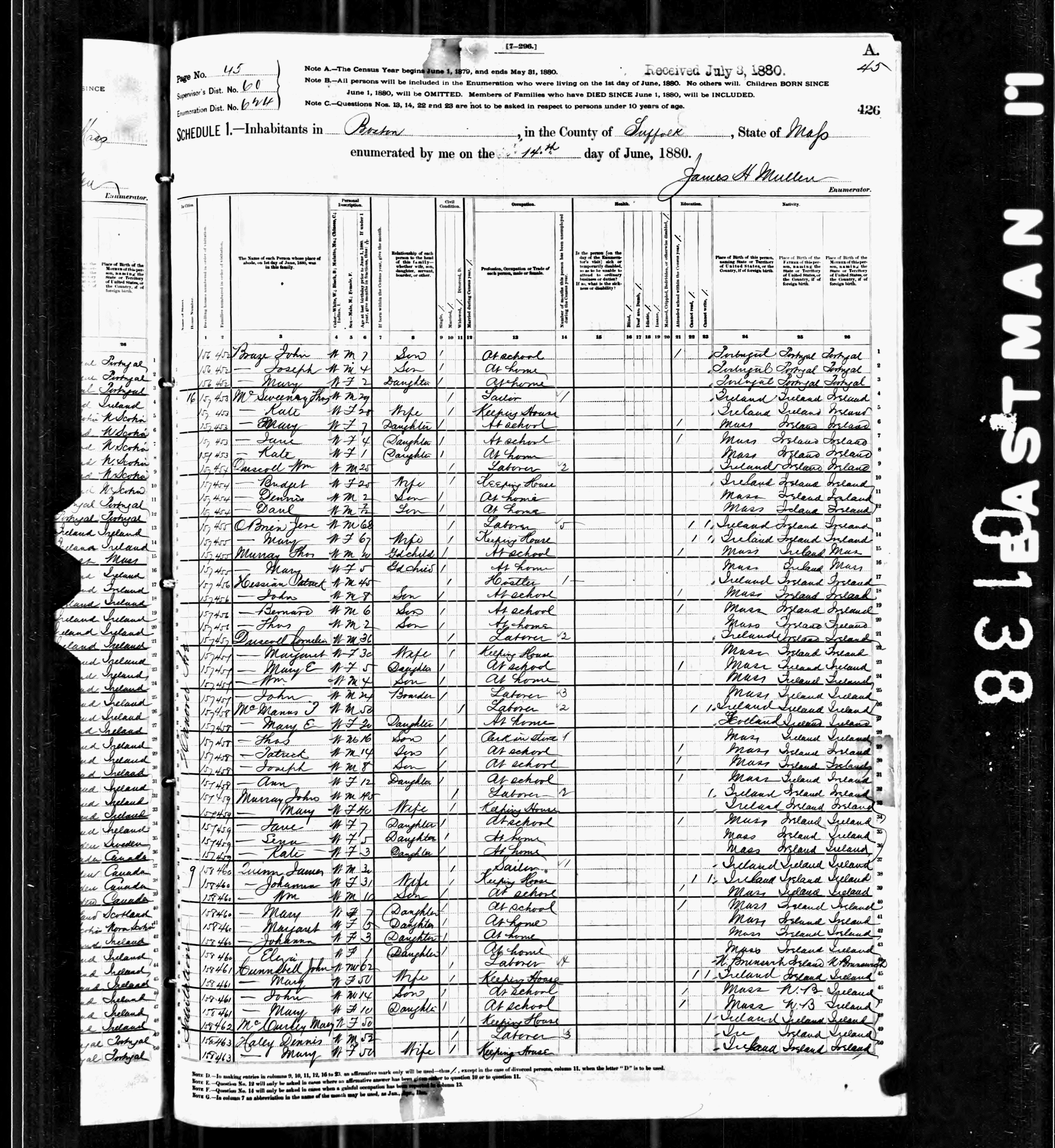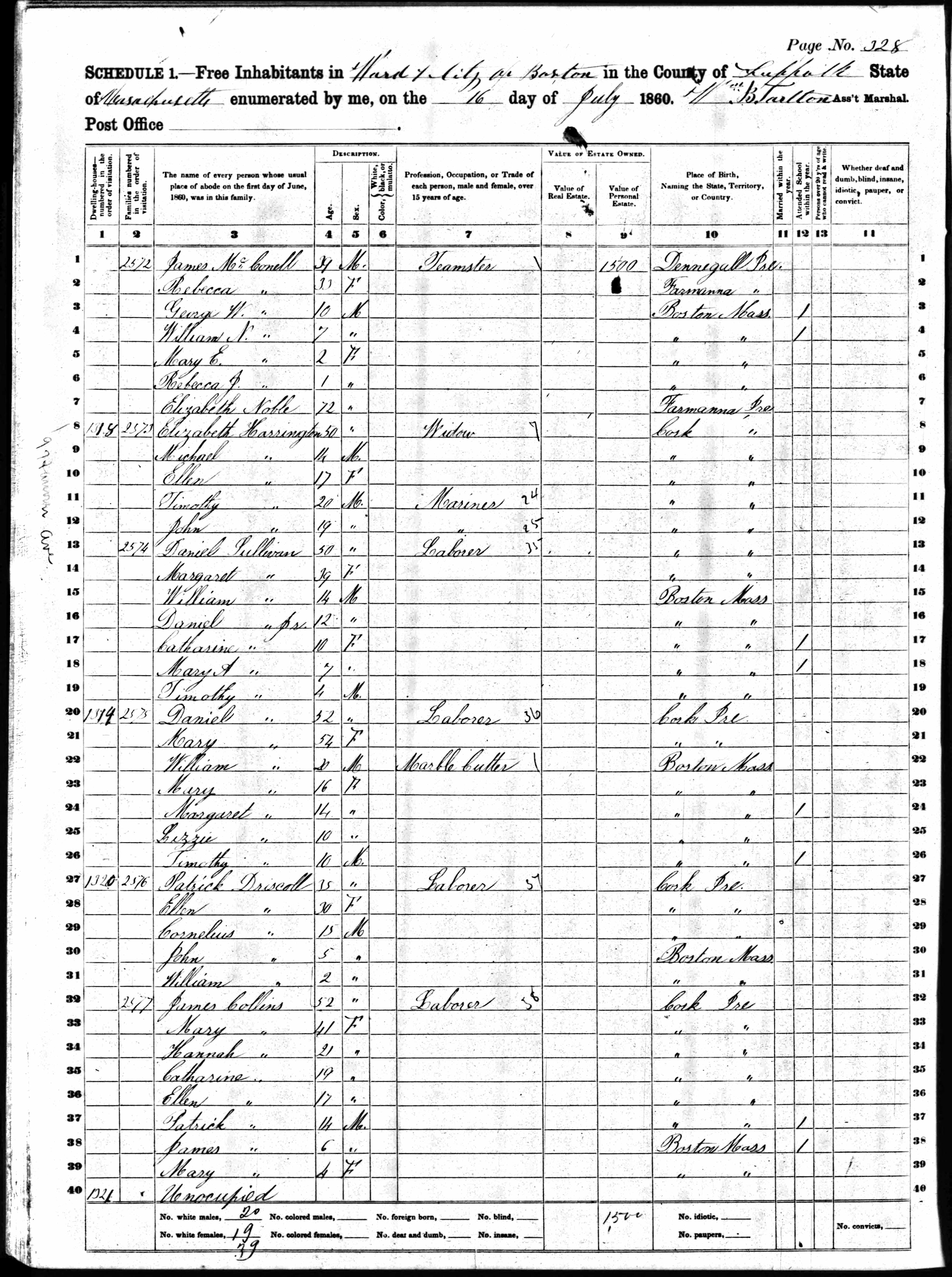 The 1860 Census lists John as five years old and living with his parents, Patrick and Ellen. Also in the house are Cornelius (age 15), and William (Age 2). Patrick, John's father, is listed as being born in Cork, Ireland, as are Ellen and Cornelius. John was probably the first family member born in the United States. He and his younger brother William were both born in Boston, so the family emigrated some time before 1856.