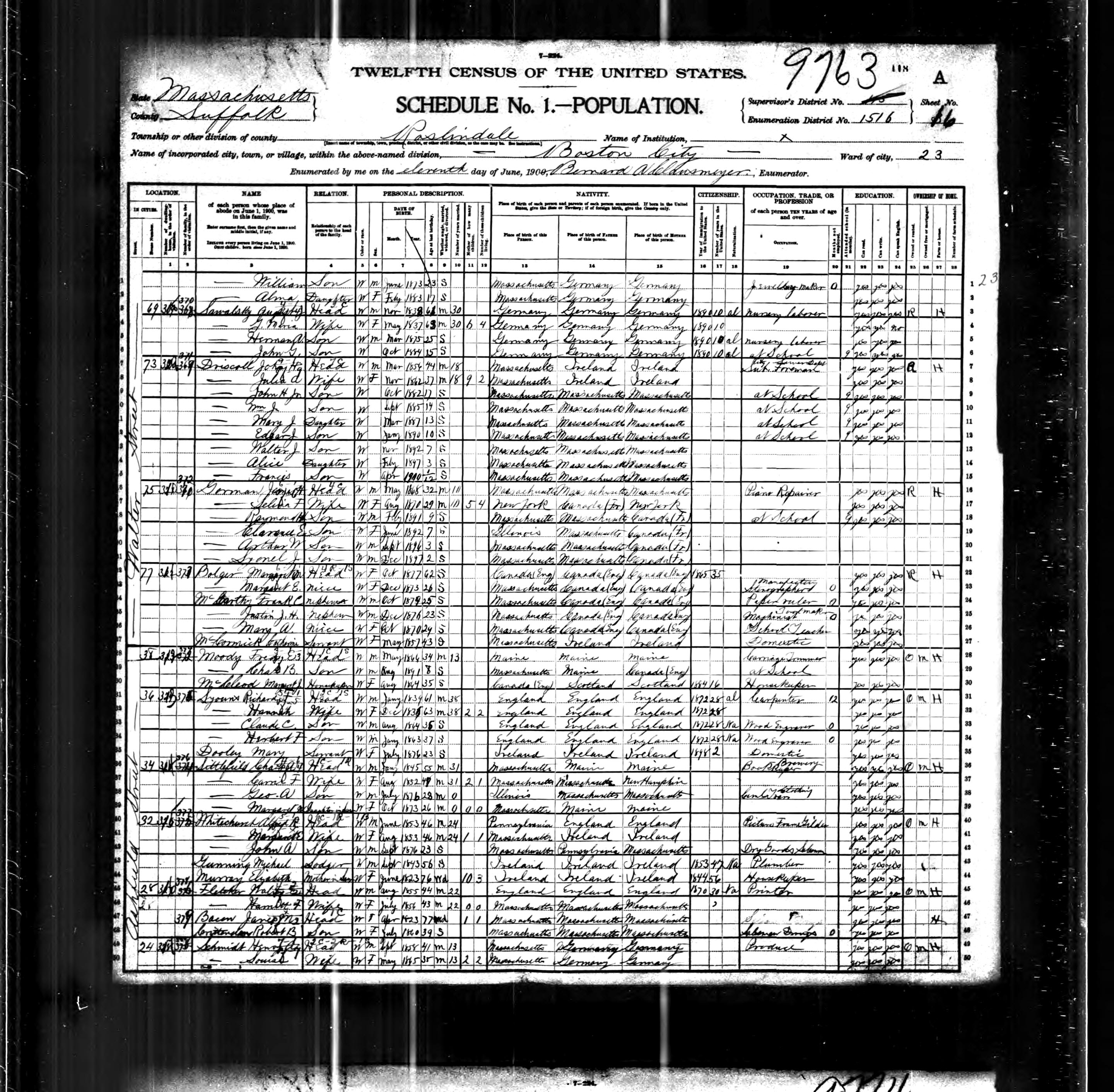 Julia and John had nine children together, two of whom died at an early age. Joseph Stephen Driscoll died of croup at age 2, and the first Edgar Joseph Driscoll died of cholera at less than a year. The 1900 Census has John and Julia living at 73 Walter Street, Roslindale with their seven children.